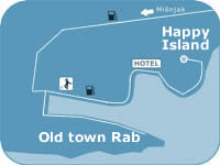 There are four ferryboats going both directions non-stop during peak season. The ride takes only 15 minutes, and the line is active all year around. When from Jablanc (on the shore) you arrive at Mišnjak (Rab), there are approx. 12 more kilometers to Happy Island. The route takes you straight center city of Rab. Take left at the roundabout and follow the shore route. You will pass by Hotel Padova (Padova I). Although the road gets narrower you are still on the right route. Reaching the second valley (Padova II) turn left into the first street after the Restaurant More More and the café on the shore. Happy Island is at the end of the street.